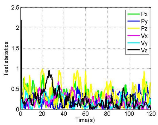 As shown in Figure 12 and Figure 13, when loosely coupled GNSS/IMU is spoofed by slowly varying spoofing, although the test statistics of the loosely coupled system increase compared with the case without spoofing, they do not exceed the alarm threshold. To sum up, when the loosely coupled system is spoofed by slowly spoofing, its test statistics will not raise an alarm.