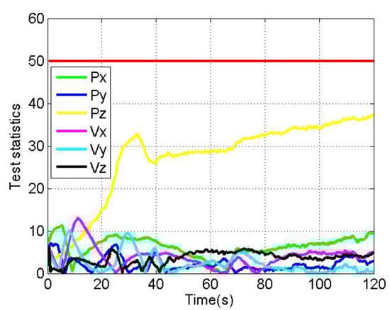 Figure 12 and Figure 13 show the changes of each test statistic of the loosely coupled GNSS/IMU system without spoofing and with spoofing, respectively. Here, the threshold is set to 50. Px, Py, Pz, Vx, Vy and Vz respectively represent the test statistics of the position in the X direction, Y direction and Z direction; the test statistics of the velocity in the X direction, Y direction and Z direction in the ECEF coordinate system; and the red line represents the alarm threshold line.