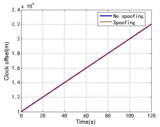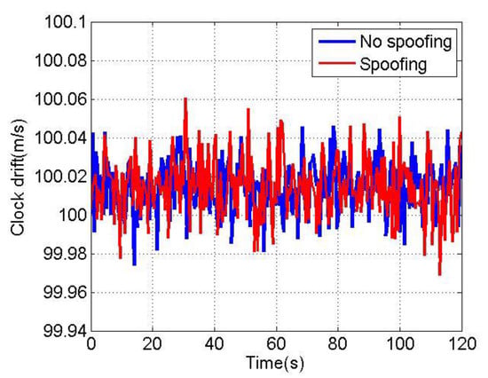 As shown in Figure 14 and Figure 15, when the loosely coupled system is spoofed by slowly varying spoofing, the estimated loosely coupled clock offset is close to the same, compared with the case without spoofing; although the estimated clock drift fluctuates slightly, it can always remain greater than 99.7 m/s and less than 100.1 m/s. To sum up, the changes of the loosely coupled clock offset estimation and clock drift estimation are also close to those without spoofing.