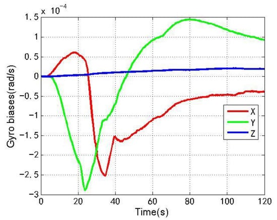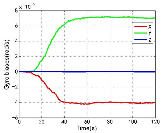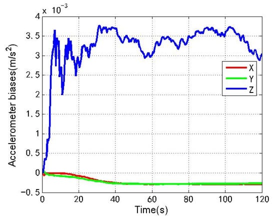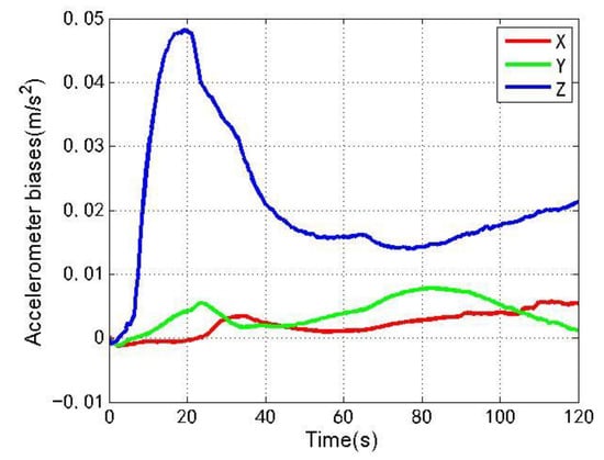 Figure 16 and Figure 17 show the changes of the accelerometer biases estimation and gyro biases estimation of the loosely coupled GNSS/IMU system without spoofing. The red line, green line and blue line respectively represent the X, Y and Z axis directions along the body coordinate.