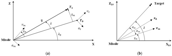 For the IGC problem, we considered missile terminal homing phase geometry in a two-dimensional plane. Figure 1a depicts planar homing engagement geometry, where the subscripts and denote the missile and target. Reference coordinate system X–Z is centered at the missile’s center of gravity; initial target position and deviated target position are defined on the reference coordinate. Initial line-of-sight (LOS) angle , LOS angle displacement from initial LOS frame , and range-to-go are also represented. Missile acceleration, velocity, and flight-path angle are denoted by , respectively. Relative displacement is defined as a normal distance between the target position and initial LOS. In Figure 1b, the seeker look angle , angle of attack , and body-fixed coordinate system are denoted. Reference coordinate frame XL0–ZL0 is the initial LOS frame whose origin is also located at the missile’s center of gravity. It is assumed that, in the terminal homing phase, the distance between the missile and target is small enough so that linearization can be performed on the initial LOS frame. Additionally, missile velocity is assumed to be constant.