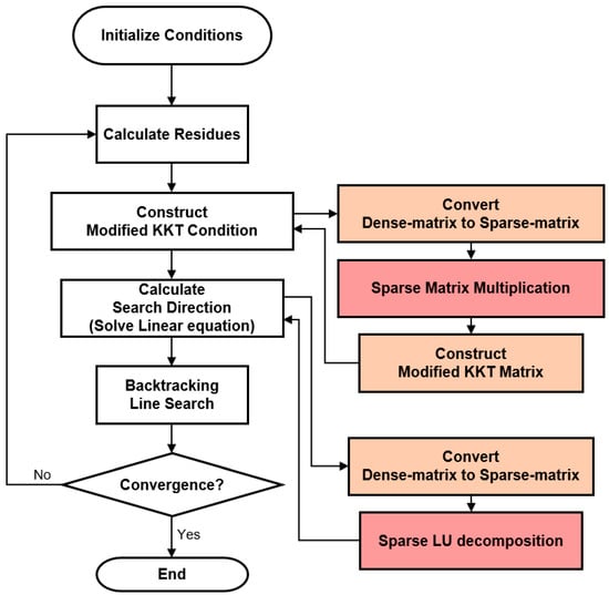 As shown in Figure 2, the PD-IPM algorithm applied to this application is divided into four parts: (1) calculate residues, (2) construct modified KKT matrix, (3) calculate search direction, and (4) backtracking line search. To improve the computation speed of the algorithm, we measured the computation time for each part of PD-IPM and proposed a method of partially accelerating the parts that required improvements.
