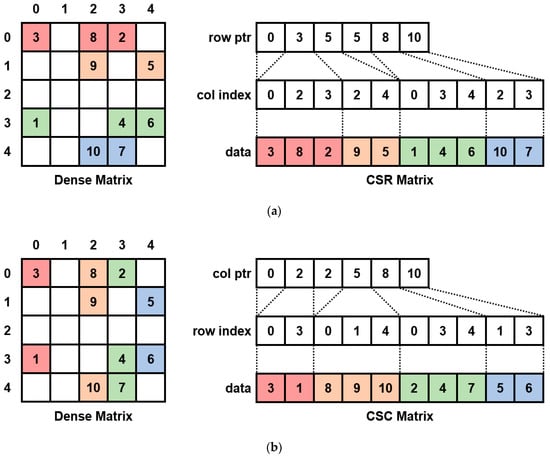 The examples of sparse-matrix conversions: (a) Dense to CSR conversion; (b) dense to CSC conversion.
