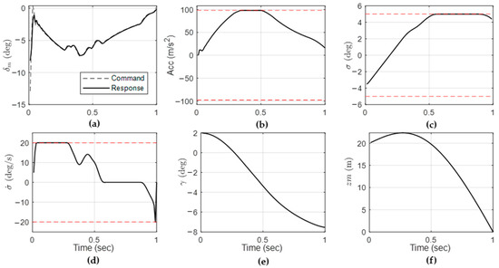 Figure 4 shows the single-step simulation results obtained under given design parameters. The optimization problem in Equations (7) and (8) were solved using PD-IPM. The red dotted line on the graph represents the given constraints of acceleration, seeker look angle, and look-angle rate. It is shown that the target was successfully intercepted within the given limitations.