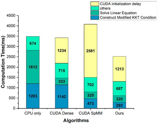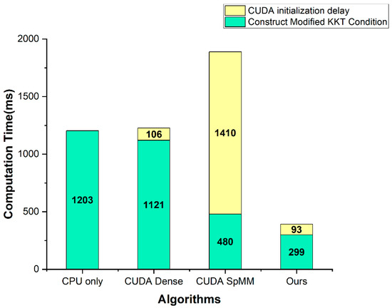 Figure 5, Table 5 show the computation time comparison results for the construct modified KKT condition part, and Figure 6, Table 6 show the computation time comparison results for the entire application. In the solve linear equation part, the CPU only was applied with the Eigen library, and the other three methods were improved using the cusolverSpcsrlsvluHost function of the CUDA cusolver library. The CUDA initialization delay is a delay that occurs when calling the CUDA API and initializing the GPU. Therefore, it occurs only once during the entire application runtime and is not directly related to the algorithm.