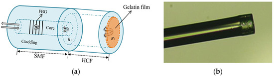 The working principle for humidity measurement is based on the humidity-induced thickness change in the gelatin film that changes the cavity length of the FPI formed by the two reflective surfaces, as shown in Figure 1a. When the light enters air hole of the HCF from the SMF, Fresnel reflection happens at the silica–air interface. When the light propagates to the gelatin film, reflection happens again at the air–gelatin interface. These two parts of the reflected light combine in the core of the SMF and lead to light interference over there. The reflected output signal contains the interference fringe of the FPI, where the dip or peak wavelengths will shift with the humidity because the latter changes the thickness of the gelatin film and hence the length of the FPI cavity.