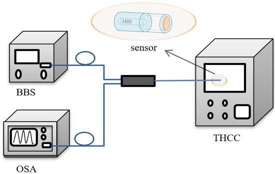 The experimental setup of the humidity measurement is shown in Figure 2. It consists of a broadband light source (BBS), an optical spectrum analyzer (OSA, MS9740A), an optical fiber circulator (OC), the FPI probe and a temperature- and humidity-controlled chamber (THCC). The FPI probe was mounted to a fixture to avoid fiber bending and the effect of vibrations and then placed into the THCC for testing. The temperature was maintained firstly at 20 °C, and the RH was changed at a step of 5%RH within the range of 20 to 80%RH. After each change, we waited for over 10 min for the purpose of the film to reach its equilibrium at the new RH level and then recorded the spectrum and read the dip wavelengths.