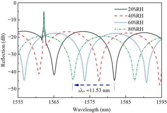 where is the change of the FPI’s cavity length. Once we achieved the relationship of the dip wavelength shifts to RH variations, RH measurement will be obtained by measuring the interference spectrum of the optical fiber FPI probe.