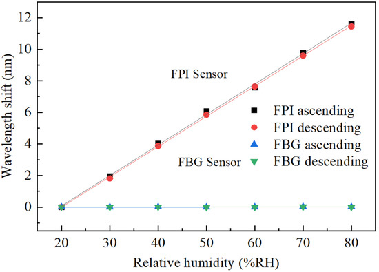 We tested the responses of the FPI probe in both ascending and descending orders of RH level. The measured wavelength shifts in the FPI probe against RH in both orders as shown in Figure 5 are found to be very close to each other, indicating that the proposed FPI probe has good reversibility. The calculated RH sensitivity of the FPI probe by linear fitting is 192 pm/%RH. The measured wavelength shifts in the FBG’s reflection peak are also shown in Figure 5. The maximum variation is only 10 pm, less than the wavelength resolution of the OSA.