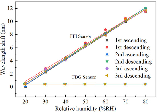 To further study the repetitive characteristics of the FPI humidity probe, two more iterations of repetitive testing were carried out. The measured results of dip wavelength shift against RH level in both ascending and descending orders are shown in Figure 6. The mean square deviation of the six sets of data is 3.96 × 10−2, indicating quite good repeatability for the proposed FPI humidity probe. The minor errors among different measurements are most possibly caused by the nonuniform RH distribution and unstable airflows in the THCC.