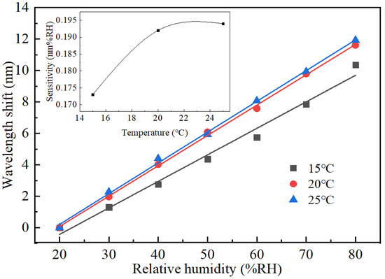 Wavelength shift against RH at different temperatures. Insert is humidity sensitivity of the FPI probe against temperature.