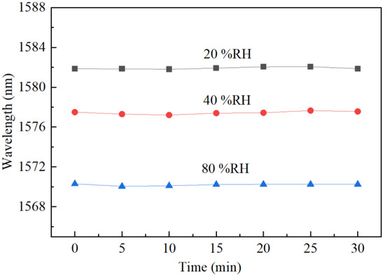 Then, the stability test of the FPI probe against time was carried out at three different RH levels of 20, 40 and 80%RH under a fixed temperature of 20 °C. The dip wavelength was measured every 5 min within a period of 30 min, and the results are shown in Figure 8. It can be seen that the measured wavelength at each RH value is quite stable within the checking period. The recorded fluctuations are no more than ±0.28 nm in the three RH cases. Taking the 194 pm/%RH sensitivity into account, the maximum error corresponds to 1.44%RH only, which can be neglected in most applications. The small fluctuation in the measurement results may also be related to the nonuniform RH distribution and unstable airflows in the THCC.