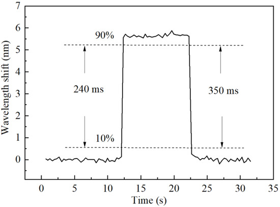 The dynamic response of the FPI probe to humidity change was then carried out by changing the humidity level from 50 to 80%RH quickly and then changing it back after 10 s. We set the OSA to automatic acquisition mode to record the wavelength shift of interference spectrum of the FPI probe at a high speed. The measured results, as shown in Figure 9, indicating that the response and recovery time, which represent the time taken for the sensor to reach 90% from 10% of its final value and for the reverse process, are about 240 and 350 ms, respectively. It should be mentioned that the humidity switching time was also counted in, so the actual dynamic response and recovery time should be much smaller. However, they are much faster than those reported in previous references, as shown in Table 1.