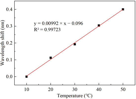 Finally, we tested the sensitivity of the FBG to temperature within a temperature range of 10 to 50 °C. The measured wavelength of the FBG’s reflection peak against temperature are shown in Figure 10. The calculated temperature sensitivity of the FBG sensor is 10 pm/°C with high linearity R2 = 0.99723. Since the FBG is not sensitive to RH variations, it can provide the accurate information of environmental temperature for reference when the FPI humidity probe works.