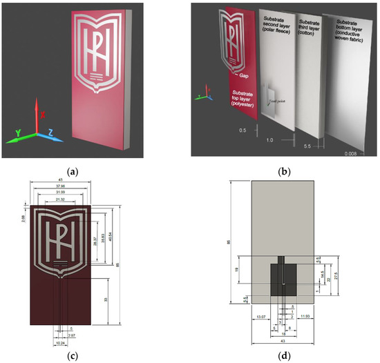 This paper aims to realize an aesthetic logo-based antenna made entirely of textile materials, for an unobtrusive integration into a garment or an accessory. A highly flexible and conductive woven fabric P1168 (Adafruit, New York, NY, USA), with a thickness of 8 μm, was selected for the conductive parts of the antenna. For the antenna’s substrate, among the available non-conductive fabrics, we chose two knitted fabrics (polyester and cotton) and a non-woven fabric (polar fleece). A polymer strip activated by ironing is used to attach the antenna elements. Table 3 presents the thickness and electromagnetic properties (real part of the complex permittivity (ε|) and conductivity (σ)) of the fabrics used in the antenna substrate.
