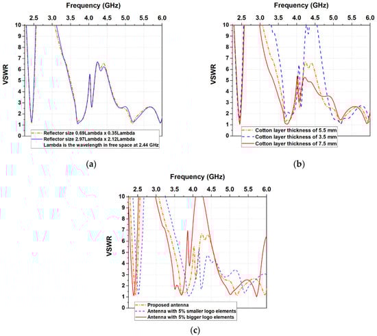Voltage Standing Wave Ratio (VSWR) at a different: (a) reflector size; (b) cotton-layer thickness; (c) logo elements size. The dimensions of the other antenna elements are those shown in Figure 1. The reflector size is in wavelengths, where Lambda is the free-space wavelength at 2.44 GHz (central frequency for the ISM 2.4 GHz).