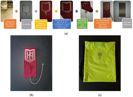 The fabrication of the proposed logo antenna was accomplished layer by layer. The block diagram of the fabrication process is shown in Figure 3a. First, the logo elements and CPW were directly shaped on the conductive fabric with a high accuracy of 0.01 mm using a cutting machine (Cricut Explore Air 2, Provo Craft & Novelty Inc., South Jordan, UT, USA). Next, the soldering points of the woven fabric with the CPW and the coaxial cable were tin-plated at 180 °C. After that, the substrate (consisting of: one layer (0.5 mm) of polyester, one layer (1.0 mm) of polar fleece, and seven layers (0.786 mm each) of cotton fabric) and a reflector were cut to have a rectangular form. The antenna-radiating elements were mounted on the top layer. Afterwards, the cotton and polar-fleece layers were attached to the reflector. As can be seen in the block diagram, a slot was made in the top layer, and the central conductor of the CPW line was mounted on the second layer. After that, a 1.13 mm mini-coaxial cable with a U.FL connector was soldered to the CPW and fixed with thread to the polar fleece, as shown in Figure 3a. All antenna elements were assembled by hand using polymer tape (SY, IKEA) that was activated by ironing. Finally, the antenna substrate and reflector were cut to the dimensions shown in Figure 1. Figure 3b shows the fabricated prototype of the antenna. Moreover, to verify the antenna performances in real-world use, the proposed antenna was fabricated and unobtrusively integrated into a backpack, as shown in Figure 3c.