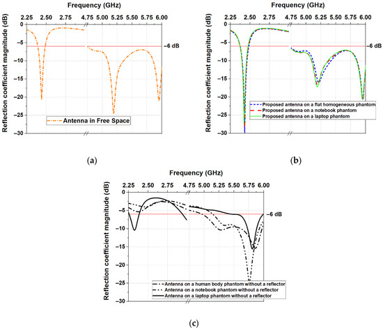 Simulated reflection coefficient |S11| of the proposed antenna: (a) in free space; (b) on a model of a human body, notebook, and laptop; (c) antenna without a reflector on a model of a human body, notebook, and laptop.