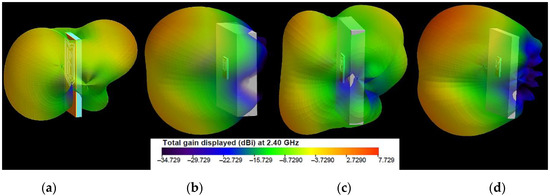 Simulated 3D radiation patterns of the antenna at 2.40 GHz: (a) in free space; (b) on the human-body model; (c) on the notebook model; (d) on the laptop model.