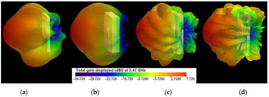 Simulated 3D radiation patterns of the antenna at 5.47 GHz: (a) in free space; (b) on the human-body model; (c) on the notebook model; (d) on the laptop model.