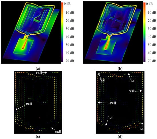 Normalized current distribution on the: (a) logo elements, CPW, and reflector at 2.4 GHz; (b) logo elements, CPW, and reflector at 5.47 GHz; (c) logo elements at 2.4 GHz; (d) logo elements at 5.47 GHz.