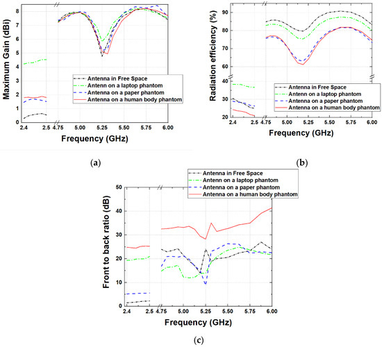 Figure 8c shows the FBR as a function of the frequency. As can be seen, due to the size of the reflector in the 2.4–2.5 GHz frequency band, the FBR in free space is about 2 dB, while across 4.75–6 GHz, it is greater than 15 dB. The results also show that when the antenna is placed on the human-body phantom, the FBR is greater than 25 dB across 2.4–2.5 GHz and is greater than 30 dB across 4.75–6 GHz. This is due to the dimensions and electromagnetic properties of the phantom. Moreover, when the antenna is placed on the paper or laptop phantom, the FBR is greater than 10 dB across 4.75–6 GHz.