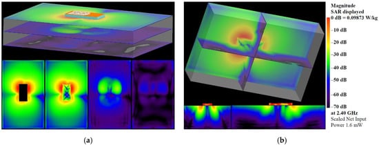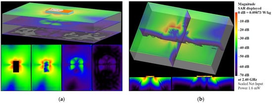 Simulated SAR distributions in different planes and cross-sections at 2.4 GHz and 5.47 GHz are presented in Figure 9 and Figure 10 to evaluate human exposure due to the electromagnetic fields generated from the proposed antenna. The SAR was calculated at the position representing the conditions of the normal use of the antenna, i.e., when it is embedded into garments or accessories worn by a person. Moreover, to highlight the visibility of the lowest SAR values, a logarithmic scale (with a range of 70 dB) is used. As can be seen from the SAR distributions, the highest SAR values are concentrated around the antenna-radiating elements. Below the antenna, the SAR values are 30 dB lower. Moreover, SAR values fall off rapidly with increasing distance from the antenna. As can be seen from Figure 9 and Figure 10, the SAR values in the plane located 35 mm below the antenna are 45–50 dB lower. The maximum local SAR averaged over 10 g mass at a net input power of 100 mW, is found to be equal to 0.5182 W/kg at 2.4 GHz and 0.16379 W/kg at 5.47 GHz. These values are 75% and 92% lower than the 10 g SAR limit of 2 W/kg, set by the international standards and guidelines [58,59].