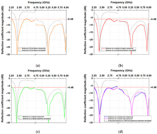 Measured and simulated reflection coefficient |S11|: (a) in free space; (b) on the copy-printer paper; (c) on the laptop; (d) on the human arm, leg, and flat phantom.