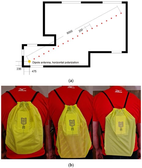 Measurement setup: (a) floor plan of the measurement locations and (b) photographs of the empty backpack, backpack with a package of copy-printer paper, and backpack with a laptop. The dimensions indicated in the figure are in millimeters.