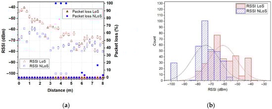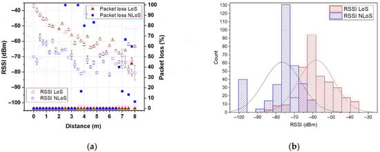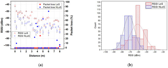 RSSI and packet loss for the backpack-integrated antenna prototype in the case of an empty backpack: (a) distributions with respect to the distance between the antennas; (b) histograms. The RSSI and packet loss for all positions in the LoS scenario are displayed with red triangles. The RSSI and packet loss for all positions in the NLoS scenario are displayed with blue squares.