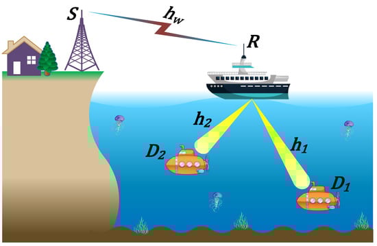 Based on the aforementioned defects resulting from the use of RF in underwater communication, the communication between the on-land and the underwater end terminals was not applicable. Therefore, the integration between RF and UOWC communication systems via relay has become indispensable [7,8,9,10,11,12]. In [7,8], the authors measured the performance of a mixed RF-UOWC transmission systems in terms of outage probability (), average bit error rate, and ergodic capacity () for different systems models. In [9,10], the authors measured the secrecy performance of a mixed RF-UOWC system where an eavesdropper tried to intercept RF communications. The authors in [11] study the performance of a dual-hop RF-UWOC transmission system in terms of and bit error rate under both fixed and variable gain relaying schemes in which different detection techniques are derived. The performance analysis of a decode-and-forward (DF) based triple hop radio frequency free space optical communication-underwater optical communication (RF-FSO-UWOC) system was discussed with closed-form expressions for and bit-error-rate in [12].