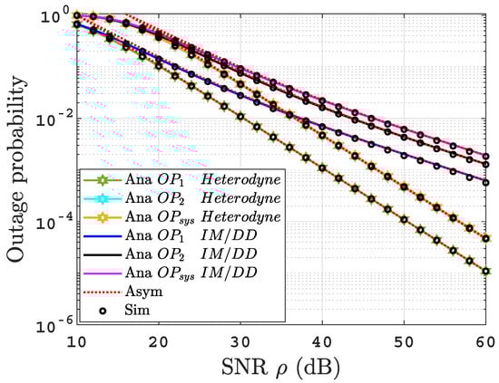Figure 2 presents the outage probability for the proposed system under uniform temperature salty water for both IM/DD and heterodyne techniques. As expected, it can be deduced that the significantly improve when heterodyne detection is implemented compared to IM/DD. This result is due to the ability of the heterodyne receiver to overcome the UOWC link’s turbulence effects, while this leads to a more complex receiver compared to IM/DD receiver. For example, the of is achieved at dB under the heterodyne receiver and dB using the IM/DD receiver. It is remarkable that the analytical and the simulation results are a match, which validates our analytical derivations. Additionally, they match the asymptotic curves at high SNR regime. In addition, to validate the derived in Section 3.5, we can observe that for heterodyne detection , the at dB and at dB; therefore, the falls with a slope of . Following the same procedure for IM/DD, we can observe that the at dB while at dB, so the falls with a slope of . These results are consistent with the diversity order .
