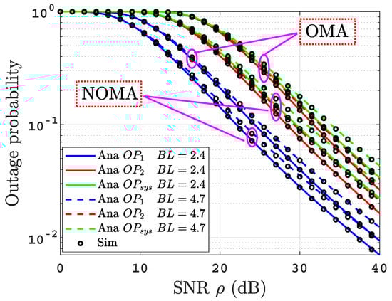 Figure 3 depicts the for the proposed system under uniform temperature salty water with varying air bubbles levels and L/min. It is clear that the increase in the level of air bubbles leads to a degradation in the performance. This is due to the rise of the water turbulence. To evaluate the performance of the proposed system in this work, we compared its performance with a benchmark scheme: the OMA-based dual-hop hybrid RF-UOWC system. Figure 3 provides the comparison between the proposed NOMA-based system versus the OMA-based system under the same system settings. According to the figure, the proposed system outperforms the benchmark in terms of performance. This is due to the fact that the NOMA technique is more spectral efficient than the OMA technique.