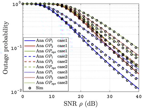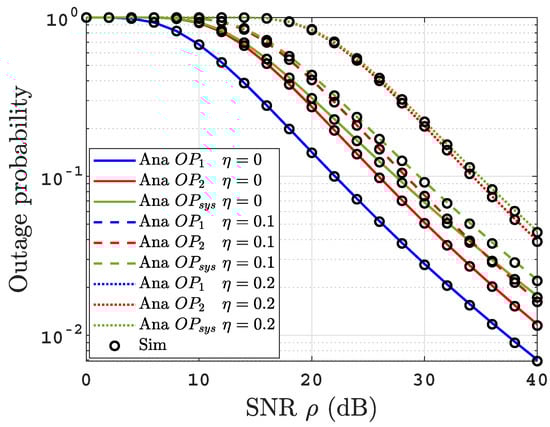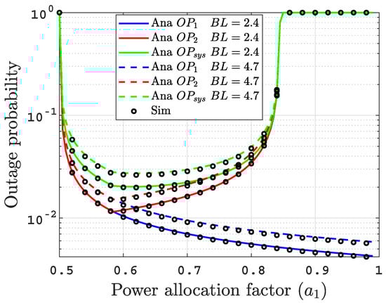 OPs over the entire range of power allocation factor at SNR = 40 dB.