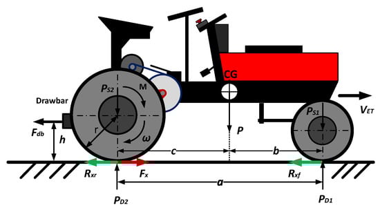 where m is the tractor mass; is the tractor velocity; Fx is the longitudinal wheel force; Rr is the rolling resistance; Rxf and Rxr are the rolling resistances of the front and rear wheels, respectively; Cr is the tire rolling resistance coefficient; PD1 and PD2 are the front wheel and rear wheel loads, respectively; a is the distance between the axles; b is the distance from the CG to the front axle; c is the distance from the CG to the rear axle; and h is the drawbar height.