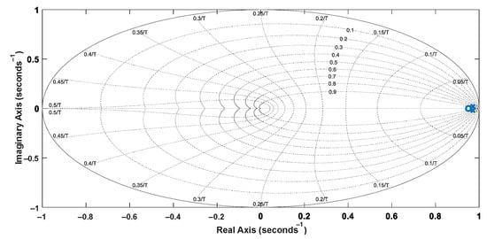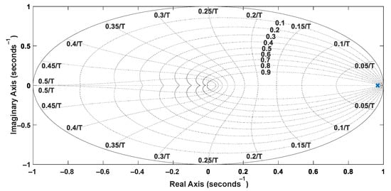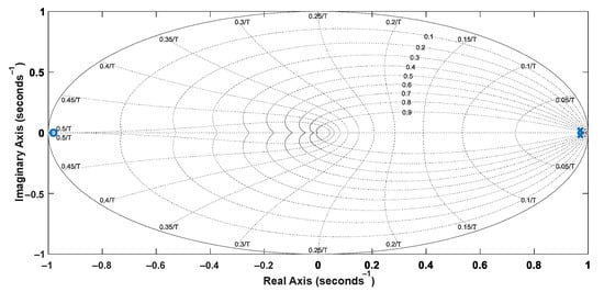The closed-loop performance in terms of the settling time and overshoot is defined by a second-order polynomial corresponding to the discrete representation of a second-order system in the time domain according to Equation (11). Thus, one can define the control law using the pole allocation method. The parameters of polynomials R(z−1) and S(z−1) are calculated from the Diophantine equation corresponding to Equation (12) and its respective coefficients in Equations (13) and (14). It is then possible to obtain the coefficients of the digital PI controller from Equations (15) and (16).