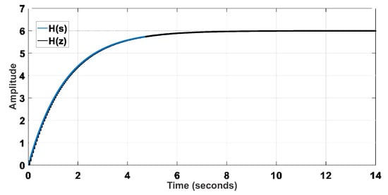 From Equations (15) and (16), one can easily obtain the parameters of the digital PI controller, that is, r0 = 0.1262 and r1 = −0.12. Similarly, the parameters of the PI controller in the continuous domain can be easily calculated from Equations (17) and (18), resulting in K = 0.12 and Ti = 0.9702. Since a limiter is employed in the control system represented in Figure 3, the digital control algorithm was not implemented based on the difference equation. In practice, it was developed from the parameters of the equivalent PI controller in the continuous domain with an anti-windup algorithm based on the guidelines provided in [29].