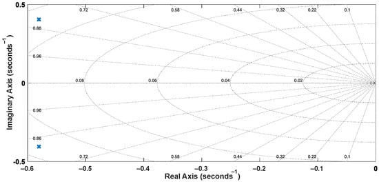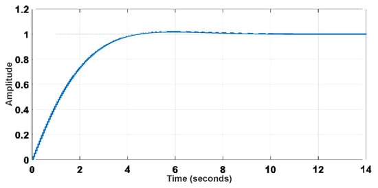 The discretized transfer function of the closed-loop system is given by Equation (23). It is worth mentioning that the roots of P(z−1) are the closed-loop poles, resulting in p1 = −1.9423691 and p2 = −0.9435861. The pole-zero map and the step response of the discretized closed-loop system are shown in Figure 11 and Figure 12, respectively.