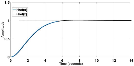 The reference model can be defined from proper design criteria, resulting in Equation (21), whose discretized form is Equation (22). Then, it is possible to represent the reference model in terms of Figure 8 and Figure 9. The step response of the reference models is also shown in Figure 10.