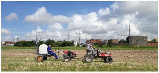 The electric tractor shown in Figure 14 was tested on firm soil with and without the proposed slip control to assess the behavior of several key variables and establish a fair comparison between both approaches. Three trial sessions were performed and repeated three times each considering the following conditions: traction motors at the maximum rotating speed while the slip control is disabled, slip controlled manually by the operator through the pedal, and slip control enabled to adjust the rotating speed automatically.
