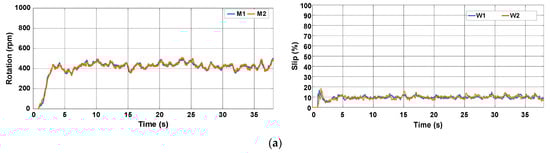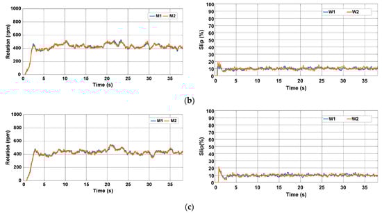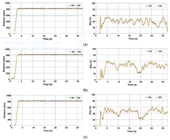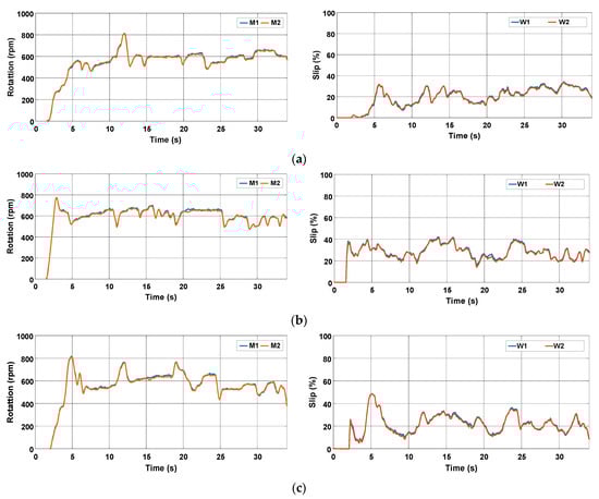 Rotation speed of electric motors and wheel slip during the trial sessions carried out on firm soil with the slip manually controlled by the operator. (a) T#2.1; (b) T#2.2; (c) T#2.3.