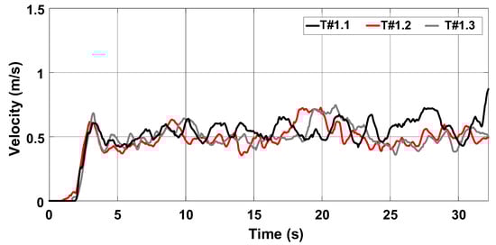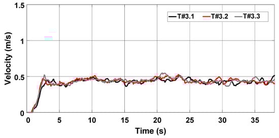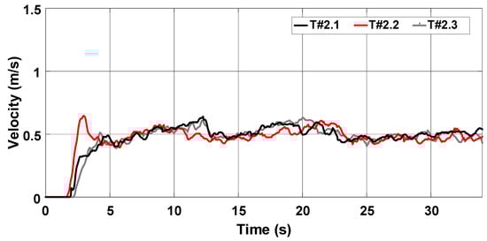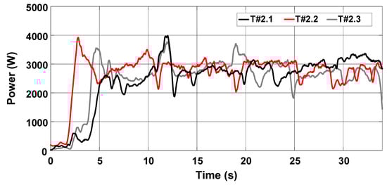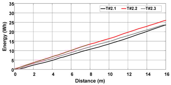 The average velocity of the electric tractor during tests T#2.1, T#2.2, and T#2.3 varied between 0.49 m/s and 0.52 m/s, as shown in Figure 22. The current drawn from the battery ranges between 57.05 A and 59.54 A in Figure 23, resulting in an average power varying between 2742.94 W and 2854.64 W. The resulting energy consumption in Figure 24 varies between 21.94 Wh and 24.51 Wh. Table 2 summarizes the main parameters associated with the data recorded during the tests.