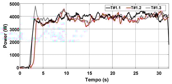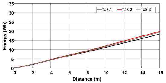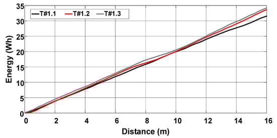 Figure 17 shows that the average velocity of the electric tractor varies between 0.49 m/s and 0.55 m/s. The current drawn from the battery bank is between 79.28 A and 83.43 A, corresponding to an active power between 3790.68 W and 3968.68 W according to Figure 18. The energy consumption varies between 29.5 Wh and 32 Wh during the 15 m course according to the profile represented in Figure 19. The main parameters measured during the trial sessions are summarized in Table 1.