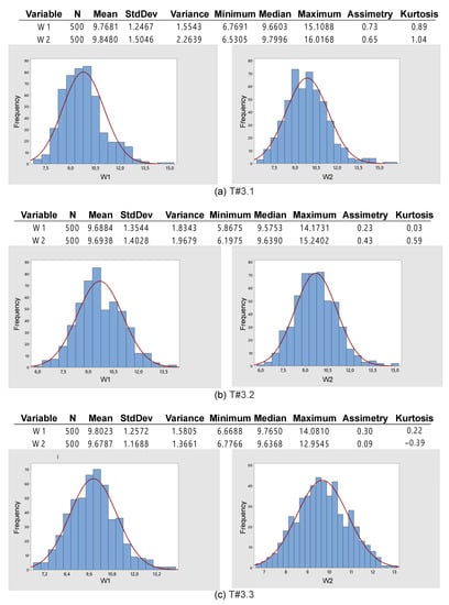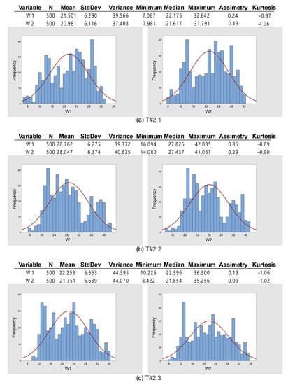 Figure 15 shows the behavior of the rotation speed and slip during the three tests. It is observed that the rotation speed of motors M1 and M2 remains nearly constant as desired, but the slip of the rear wheels is high. Figure 16 represents the data in terms of basic descriptive statistics and histograms (normal curve) related to the slip of the rear wheels W1 and W2. The mean slip ranges from 39.32% to 46.16% without active control. In turn, the standard deviation is between 7.6% and 9.26%. Thus, it is evident that the slip is much higher than the limits recommended for activities on firm ground (8% to 10%). Figure 16 also denotes that the symmetry is between −1.05 and −0.33, whereas the kurtosis is between −0.52 and 0.66. It is then reasonable to state that the data are normally distributed according to [31].