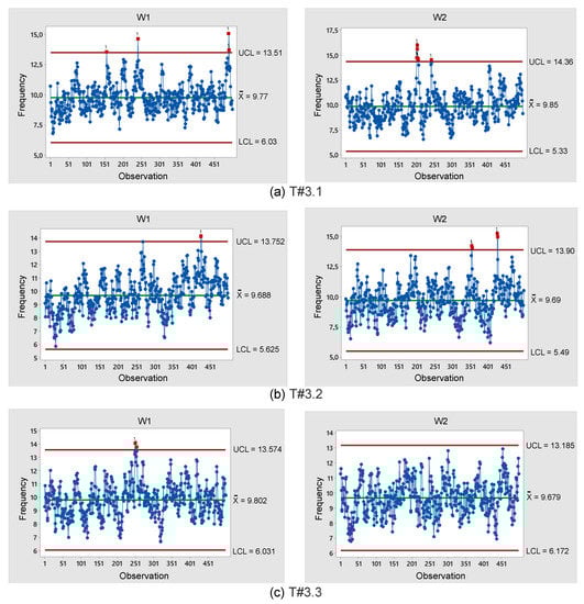 Besides the basic descriptive statistics, SCP was also used to perform a more in-depth analysis based on control charts. According to [33], a control chart represents a way of examining variability in time-oriented data. The graph contains a centerline that corresponds to the average value of the controlled and monitored variable. It also contains two other horizontal lines, called the upper control limit (UCL) and lower control limit (LCL). They consist of a pair of statistically derived thresholds that reflect inherent or natural variability in the process, considering three times the standard deviation of concentration values are above and below the centerline. Thus, control charts statistically define UCL and LCL according to Equations (24) and (25), respectively.