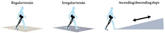 Figure 3 and Figure 4, and Table 3 show joint kinematics and range of execution, respectively, during ecological gait and WPE-assisted gait under regular indoor terrain, descending slope, ascending slope scenarios, and irregular outdoor terrain (high speed, normal speed, and low speed) scenarios. In ecological gait, the low-speed irregular scenario was characterized by a limited range of execution in hip flexion/extension and abduction/adduction movements. In the irregular terrain scenarios, joint kinematics during WPE-assisted gait tasks showed a strong similarity. Similarly, to the previously described scenarios, the WPE-assisted gait is characterized by greater hip flexion during the swing phase and no-knee flexion during the loading response phase.