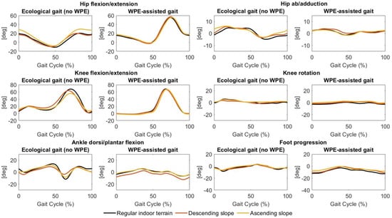 Joint kinematics (normalized as a percentage of the gait cycle) were depicted during the ecological gait and the WPE-assisted gait in the regular indoor terrain, descending, and ascending slope scenarios in Figure 2. Although temporal gait parameters did not show great inter-scenarios differences, the joint angles revealed some variations, especially in the no-WPE conditions. In the ecological gait, the ascending slope scenario was characterized by higher hip flexion and smaller knee and ankle flexions compared to the regular indoor terrain and descending slope scenarios. On the other hand, joint kinematics during the WPE-assisted gait tasks showed a strong similarity.