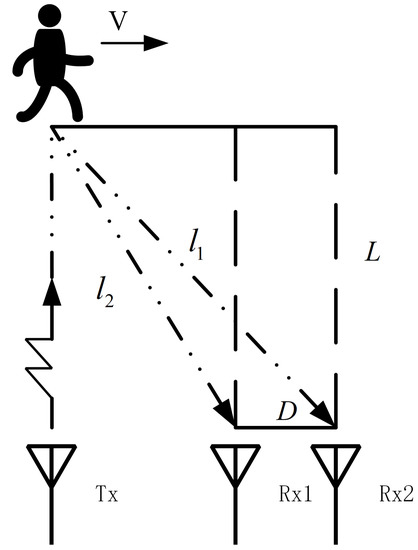 The radar system consists of two receiving antennas spaced D, as shown in Figure 2. Assuming that the aperture of the array element is far less than the distance between the signal source and the center of the array, the spherical wave emitted by the point emitter can be regarded as a plane wave. At this time, the difference of the incoming wave direction between the two antennas is very small, which can be approximately equal to . However, due to the different positions of the two antennas, there is a difference in the wave path between the receiving antennas, which leads to a slight difference in the phase of the received signal. Therefore, the angle and moving speed of the target can be estimated.