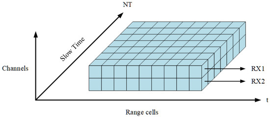 where t denotes fast time, denotes slow time, and L denotes the number of targets to be detected. In Equation (35), the first term is the signal to be detected, and the phase difference between the two antennas is also included in and .