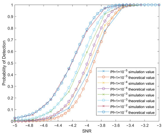 The simulation experiment still uses the radar parameters in Table 1 and simulates the detection of the target characteristic signal that was obtained after cross-correlation calculation of the two-channel echoes under a background of complex Gaussian noise. The theoretical detection performance and simulation detection performance of tangentially moving targets in a noisy environment under different signal-to-noise ratios can be obtained as shown in Figure 4.